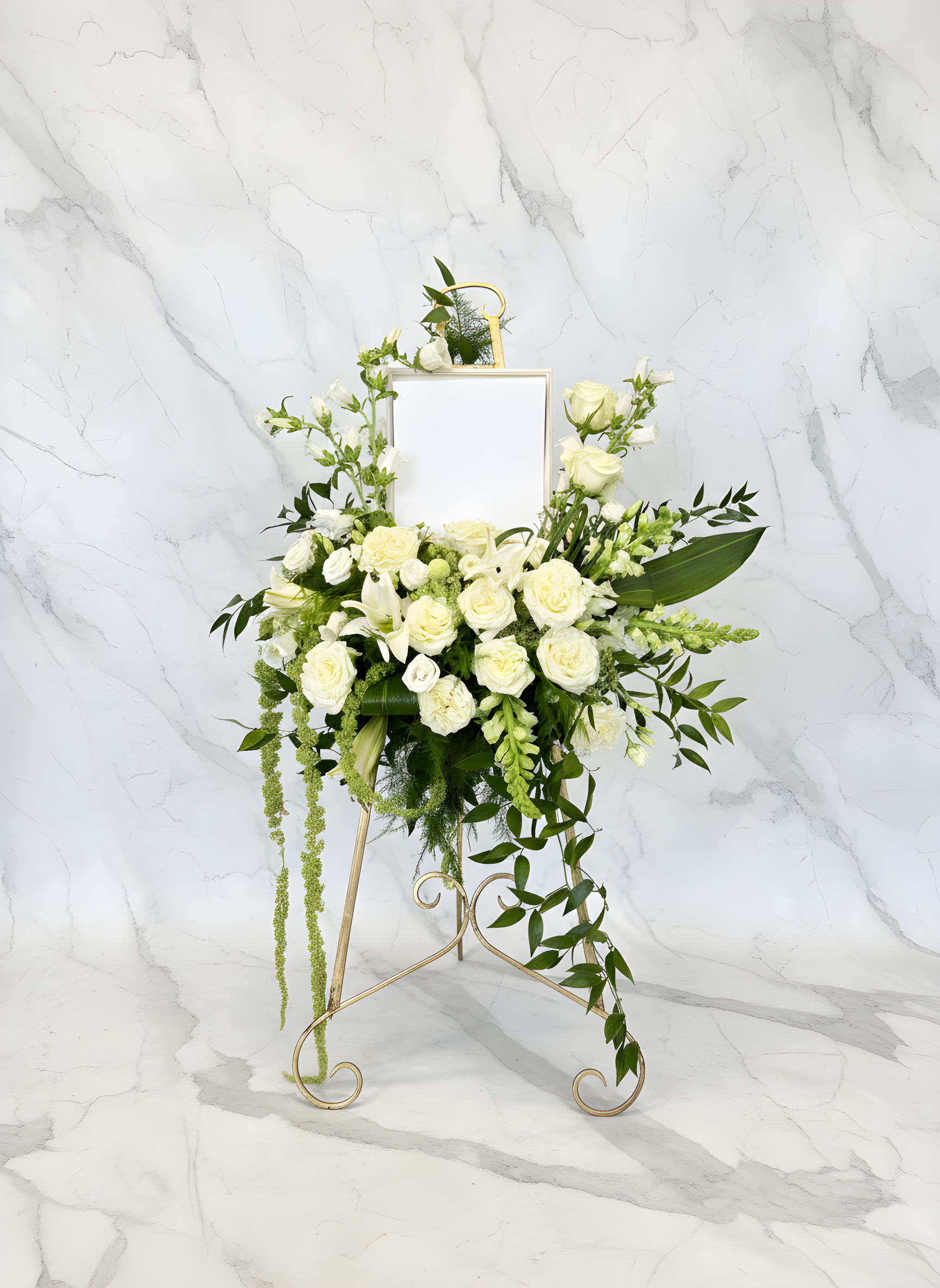 An elegant and thoughtfully designed memorial arrangement created to honor a life beautifully lived. This tribute features lush white garden roses, delicate accent blooms, and layered fresh greenery arranged in a full, garden- inspired composition beneath a framed photo display.