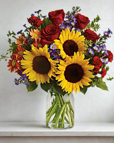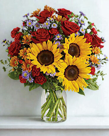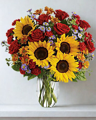 A sunny sunflower bouquet gets an autumnal spin with the addition of pretty bronze daisy mums and rich red roses. The cheerful autumn floral arrangement is rich with color, making it a stylish, energizing pick for any fall occasion.